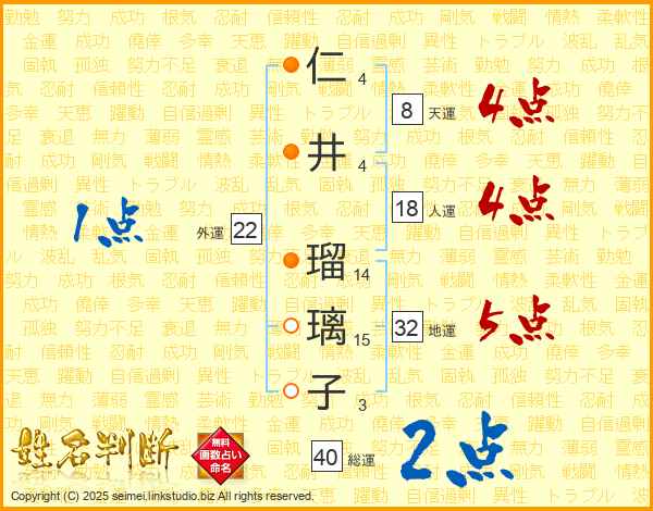 仁(4画)井(4画) 瑠(14画)璃(15画)子(3画)
