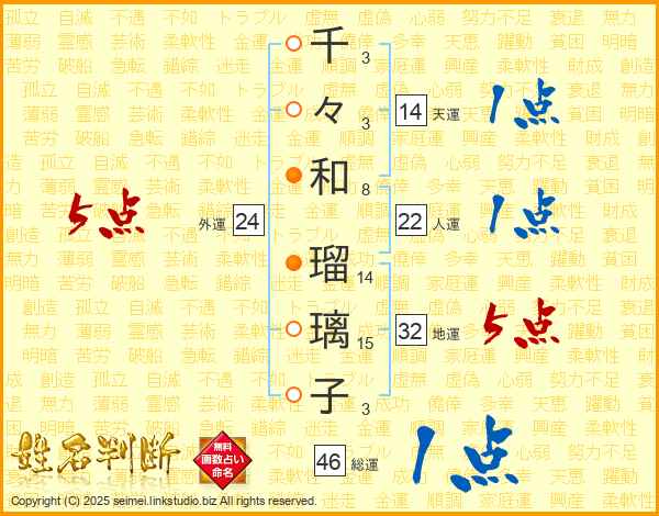 千(3画)々(3画)和(8画) 瑠(14画)璃(15画)子(3画)