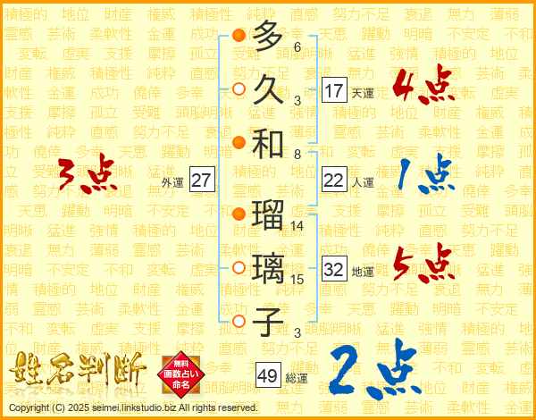 多(6画)久(3画)和(8画) 瑠(14画)璃(15画)子(3画)