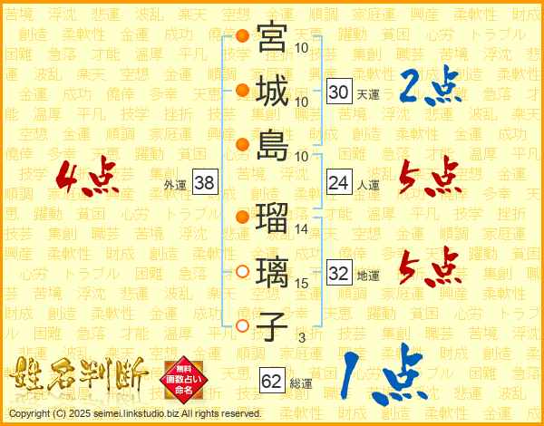 宮(10画)城(10画)島(10画) 瑠(14画)璃(15画)子(3画)