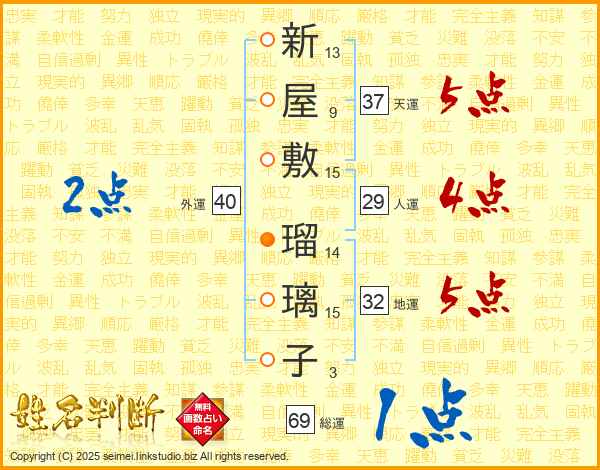 新(13画)屋(9画)敷(15画) 瑠(14画)璃(15画)子(3画)