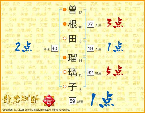 曽(12画)根(10画)田(5画) 瑠(14画)璃(15画)子(3画)