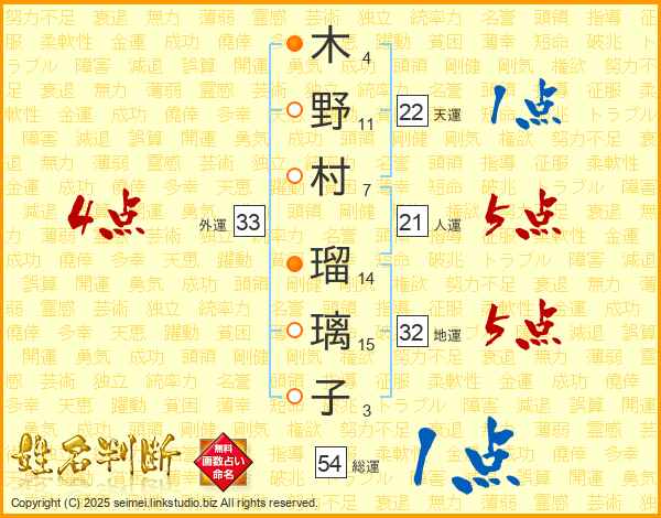 木(4画)野(11画)村(7画) 瑠(14画)璃(15画)子(3画)