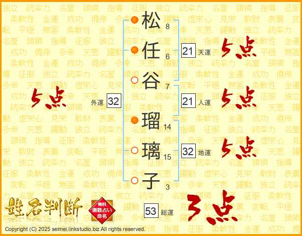 松(8画)任(6画)谷(7画) 瑠(14画)璃(15画)子(3画)