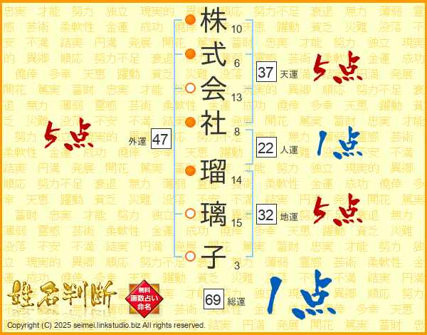 株(10画)式(6画)会(13画)社(8画) 瑠(14画)璃(15画)子(3画)