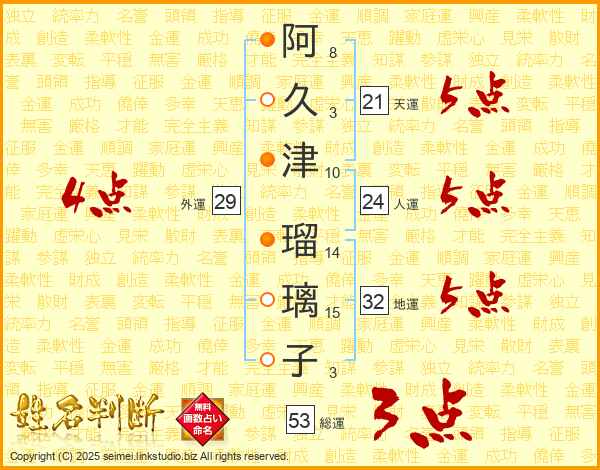 阿(8画)久(3画)津(10画) 瑠(14画)璃(15画)子(3画)