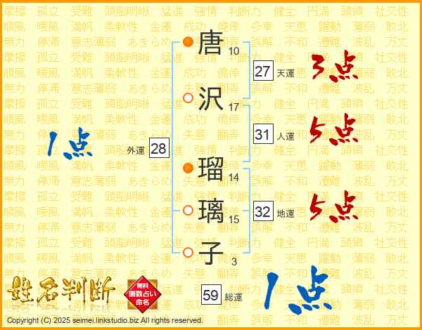 唐(10画)沢(17画) 瑠(14画)璃(15画)子(3画)