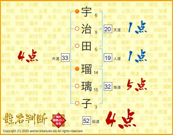 宇(6画)治(9画)田(5画) 瑠(14画)璃(15画)子(3画)