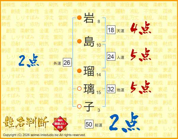 岩(8画)島(10画) 瑠(14画)璃(15画)子(3画)