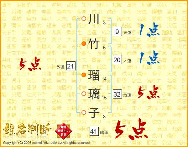 川(3画)竹(6画) 瑠(14画)璃(15画)子(3画)