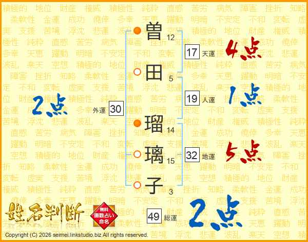 曽(12画)田(5画) 瑠(14画)璃(15画)子(3画)