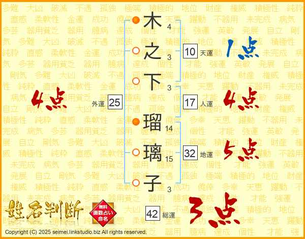 木(4画)之(3画)下(3画) 瑠(14画)璃(15画)子(3画)