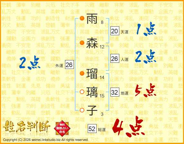 雨森瑠璃子さんの総運は52画の4点!