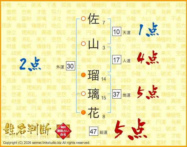 佐(7画)山(3画) 瑠(14画)璃(15画)花(8画)