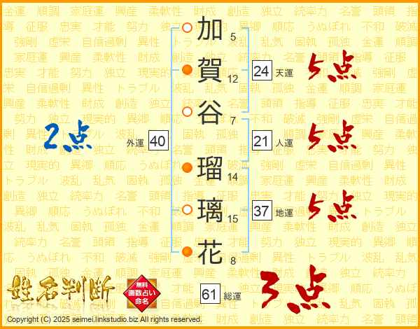 加(5画)賀(12画)谷(7画) 瑠(14画)璃(15画)花(8画)