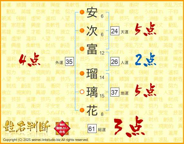 安(6画)次(6画)富(12画) 瑠(14画)璃(15画)花(8画)
