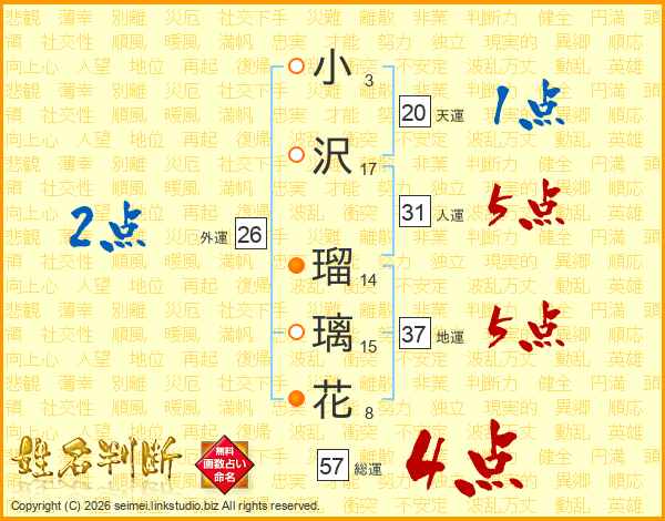 小(3画)沢(17画) 瑠(14画)璃(15画)花(8画)