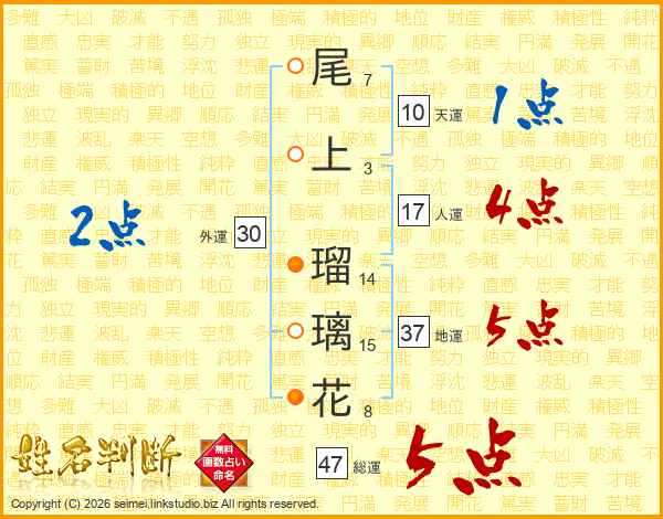 尾(7画)上(3画) 瑠(14画)璃(15画)花(8画)