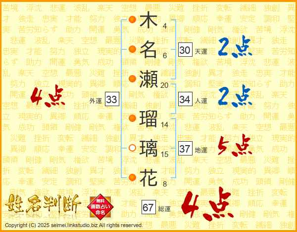 木(4画)名(6画)瀬(20画) 瑠(14画)璃(15画)花(8画)
