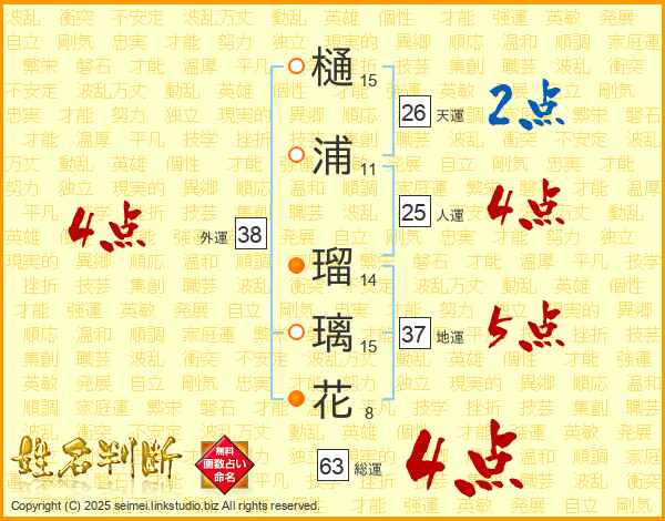 樋(15画)浦(11画) 瑠(14画)璃(15画)花(8画)