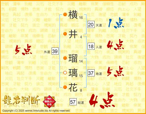 横(16画)井(4画) 瑠(14画)璃(15画)花(8画)