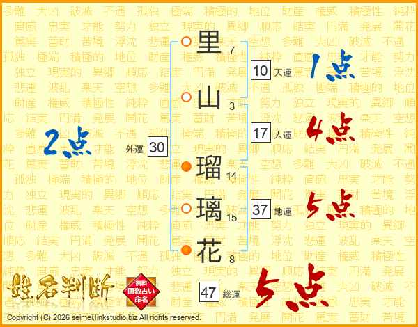 里(7画)山(3画) 瑠(14画)璃(15画)花(8画)