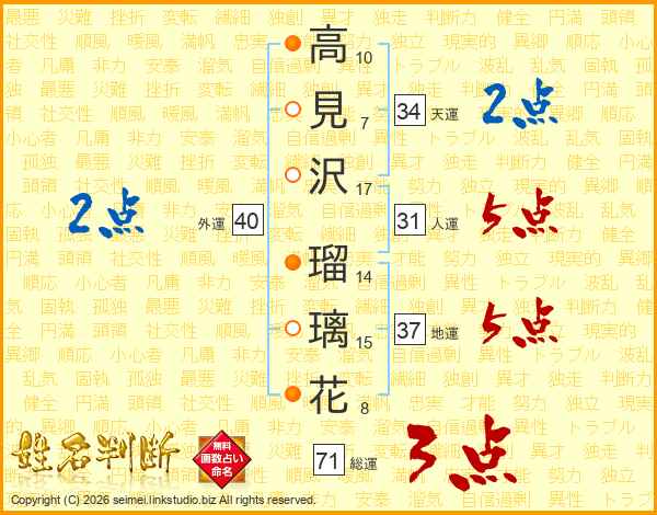 高(10画)見(7画)沢(17画) 瑠(14画)璃(15画)花(8画)