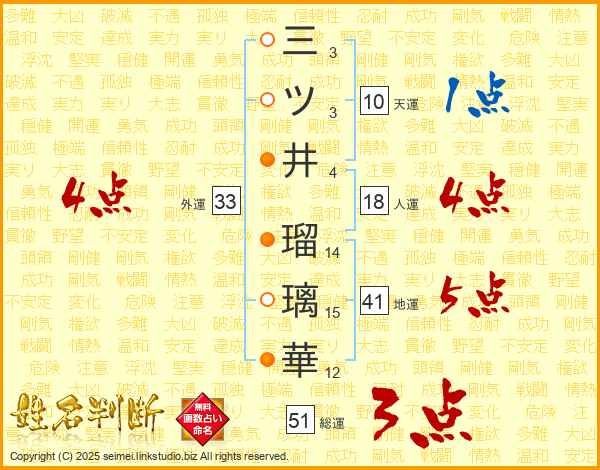 三(3画)ツ(3画)井(4画) 瑠(14画)璃(15画)華(12画)