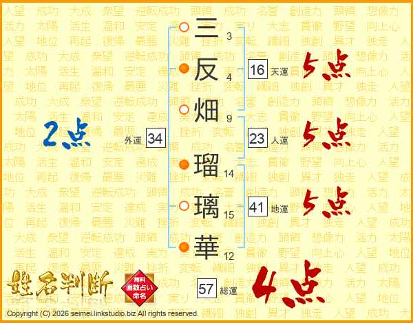 三(3画)反(4画)畑(9画) 瑠(14画)璃(15画)華(12画)