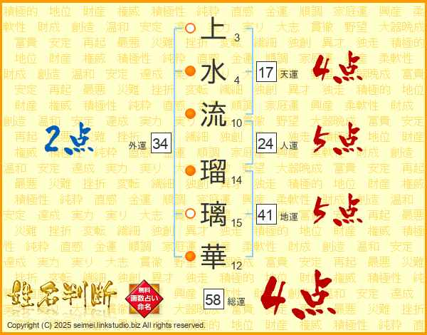 上(3画)水(4画)流(10画) 瑠(14画)璃(15画)華(12画)