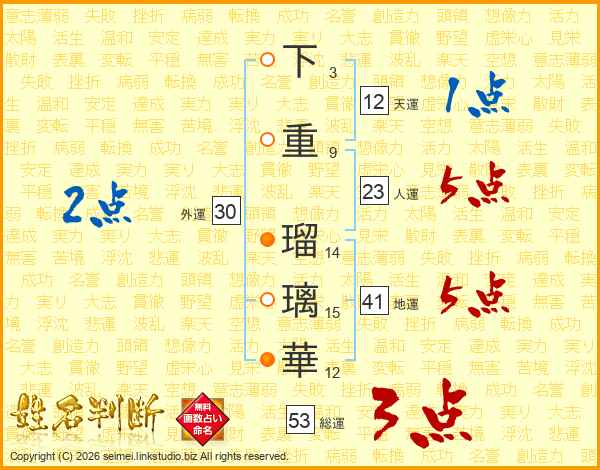 下重瑠璃華さんの総運は53画の3点!