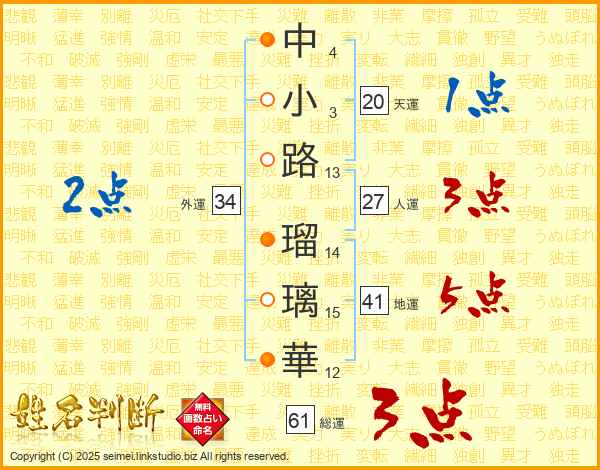 中(4画)小(3画)路(13画) 瑠(14画)璃(15画)華(12画)