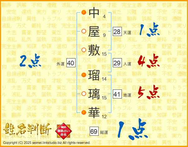 中(4画)屋(9画)敷(15画) 瑠(14画)璃(15画)華(12画)