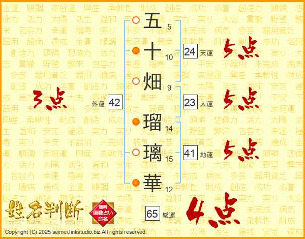 五(5画)十(10画)畑(9画) 瑠(14画)璃(15画)華(12画)