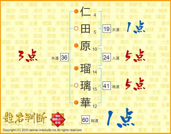 仁(4画)田(5画)原(10画) 瑠(14画)璃(15画)華(12画)
