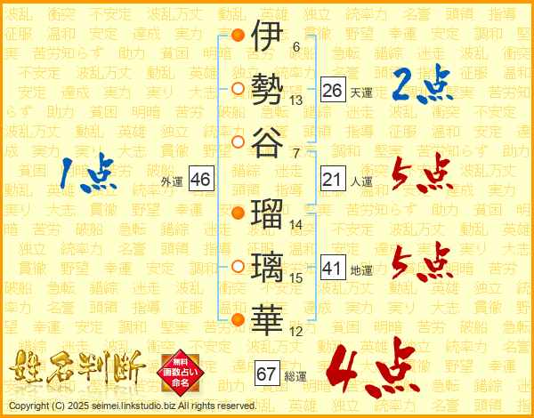 伊勢谷瑠璃華さんの総運は67画の4点!