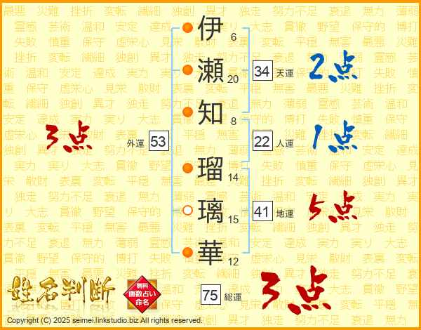 伊(6画)瀬(20画)知(8画) 瑠(14画)璃(15画)華(12画)