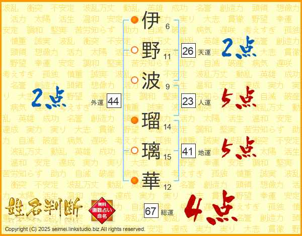 伊(6画)野(11画)波(9画) 瑠(14画)璃(15画)華(12画)