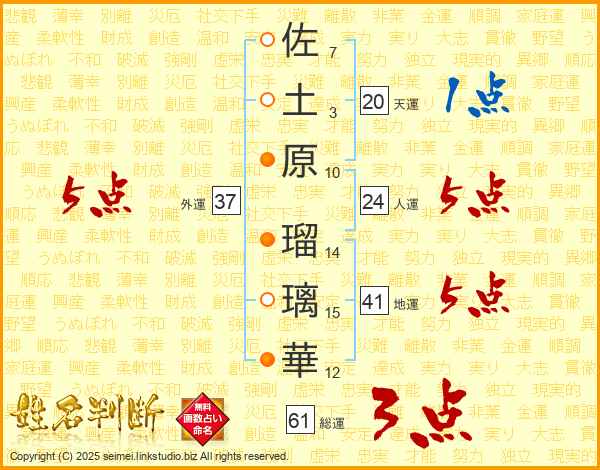 佐(7画)土(3画)原(10画) 瑠(14画)璃(15画)華(12画)