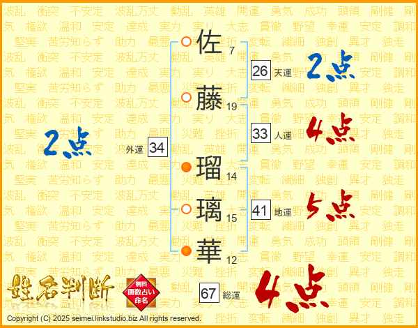 佐(7画)藤(19画) 瑠(14画)璃(15画)華(12画)