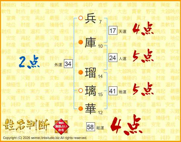 兵庫瑠璃華さんの総運は58画の4点!