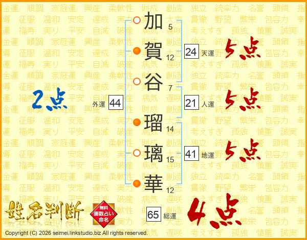 加(5画)賀(12画)谷(7画) 瑠(14画)璃(15画)華(12画)