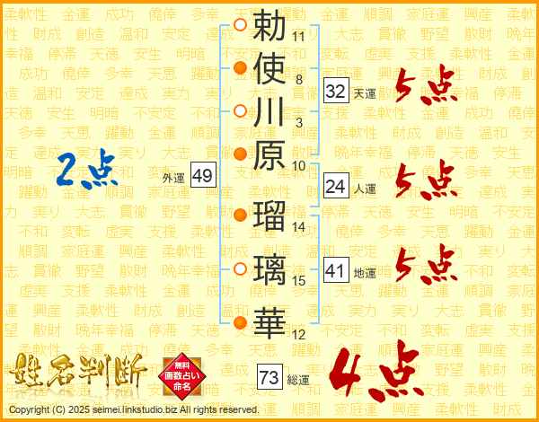勅使川原瑠璃華さんの総運は73画の4点!