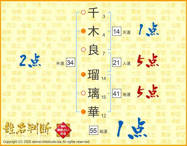 千(3画)木(4画)良(7画) 瑠(14画)璃(15画)華(12画)