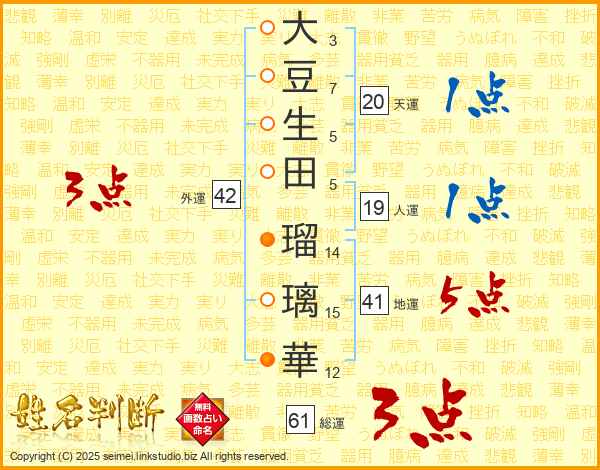 大(3画)豆(7画)生(5画)田(5画) 瑠(14画)璃(15画)華(12画)