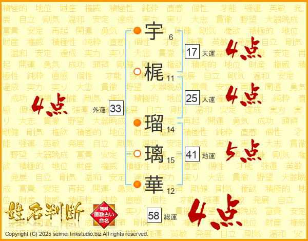 宇(6画)梶(11画) 瑠(14画)璃(15画)華(12画)