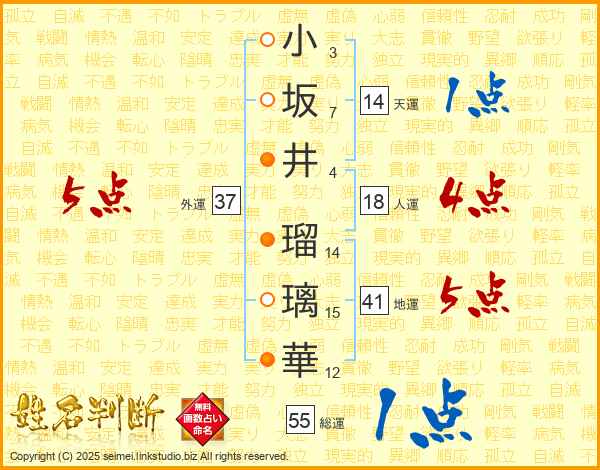 小(3画)坂(7画)井(4画) 瑠(14画)璃(15画)華(12画)
