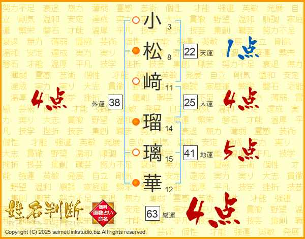 小(3画)松(8画)﨑(11画) 瑠(14画)璃(15画)華(12画)