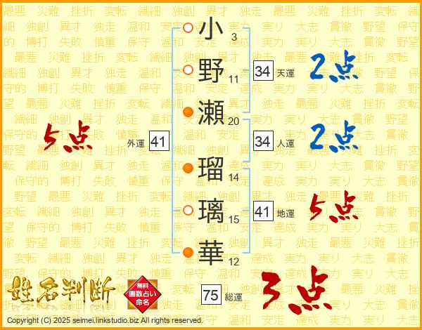 小(3画)野(11画)瀬(20画) 瑠(14画)璃(15画)華(12画)