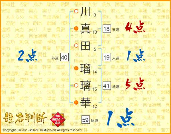 川(3画)真(10画)田(5画) 瑠(14画)璃(15画)華(12画)